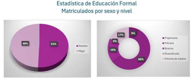 En el año 2023, el sistema de educación formal en Guatemala registró una matrícula total de 4,298,887 estudiantes, con una distribución por sexo casi equilibrada: niñas: 2,131,268 (49.6%), niños: 2,163,617 (50.4%). Aunque la diferencia porcentual parece mínima a nivel global, al desagregar por niveles educativos, se evidencia una menor participación de las niñas en los ciclos iniciales.
