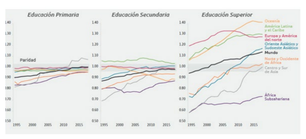 En el gráfico anterior se debe comprender que la paridad de género es casi universal, a través de tres niveles educativos: Educación Primaria, Educación Secundaria y Educación Superior. En la educación primaria un valor superior a 1.00 indica una ventaja para las niñas (sobrerrepresentación femenina), y un valor inferior a 1.00 indica una ventaja para los niños (sobrerrepresentación masculina). representado por la línea negra, se interpreta que la paridad ha sido alcanzada.