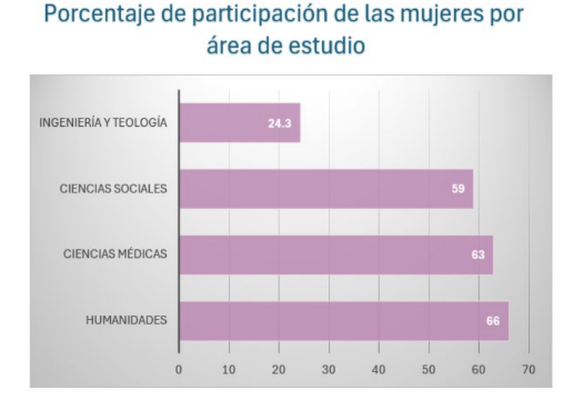 En la actualidad, aunque las mujeres han logrado equidad en la matrícula, no se observa así en todas las áreas, ya que se concentra en las sociales y humanísticas. Según el INE como se muestra en el gráfico 5, en el 2015, en la USAC y en las privadas, 63 de cada cien estudiantes de Ciencias Médicas eran mujeres; en Ciencias Sociales eran 59 de cada cien, y en Humanidades, 66. En Ingeniería y Tecnología, el 24.3 por ciento de inscritos en carreras de esa área eran mujeres. (Instituto Nacional de Estadística y Geografía [INE], 2015).