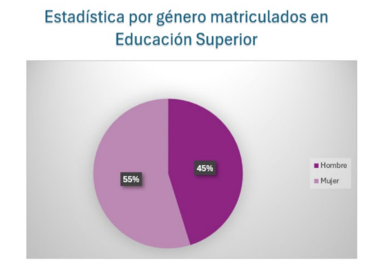 mujeres matriculadas: 209,678 (54.9%) hombres matriculados: 172,649 (45.1%). Este dato revela un incremento sostenido en la participación de mujeres, quienes ahora representan la mayoría del estudiantado en este sector, lo cual marca un cambio importante respecto a décadas anteriores donde predominaba la matrícula masculina.