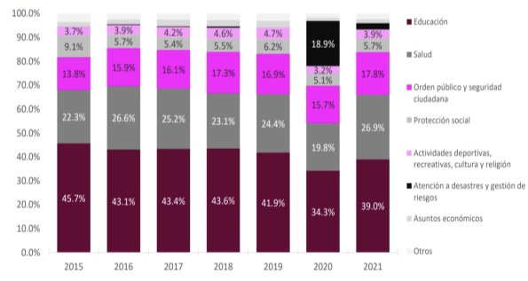 Distribución de la Inversión pública en juventudes (Ipjuve) según finalidad, en porcentajes del 2015 al 2021